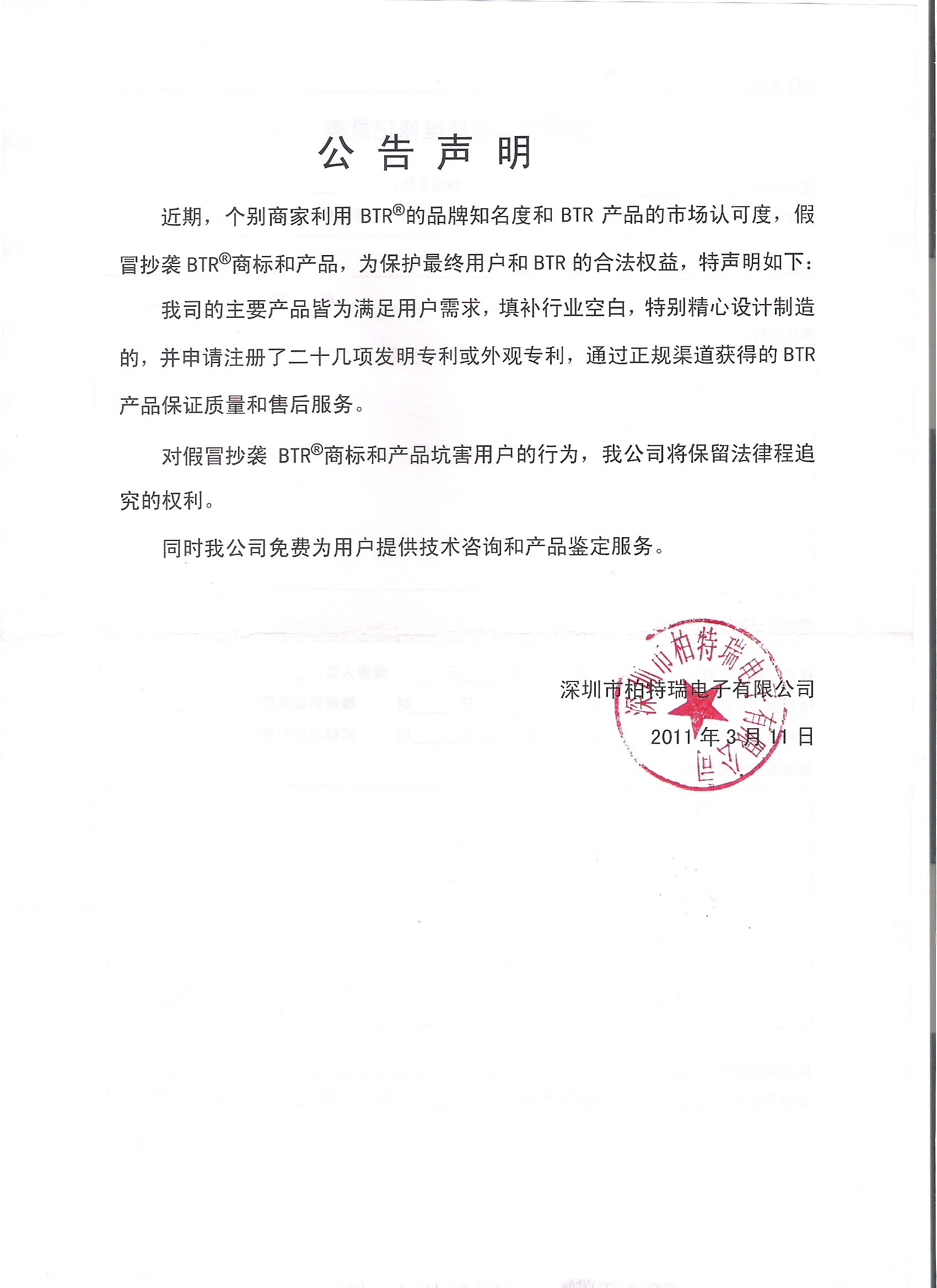 和產品,為保護最終用戶和BTR的合法權益,特聲明如下: